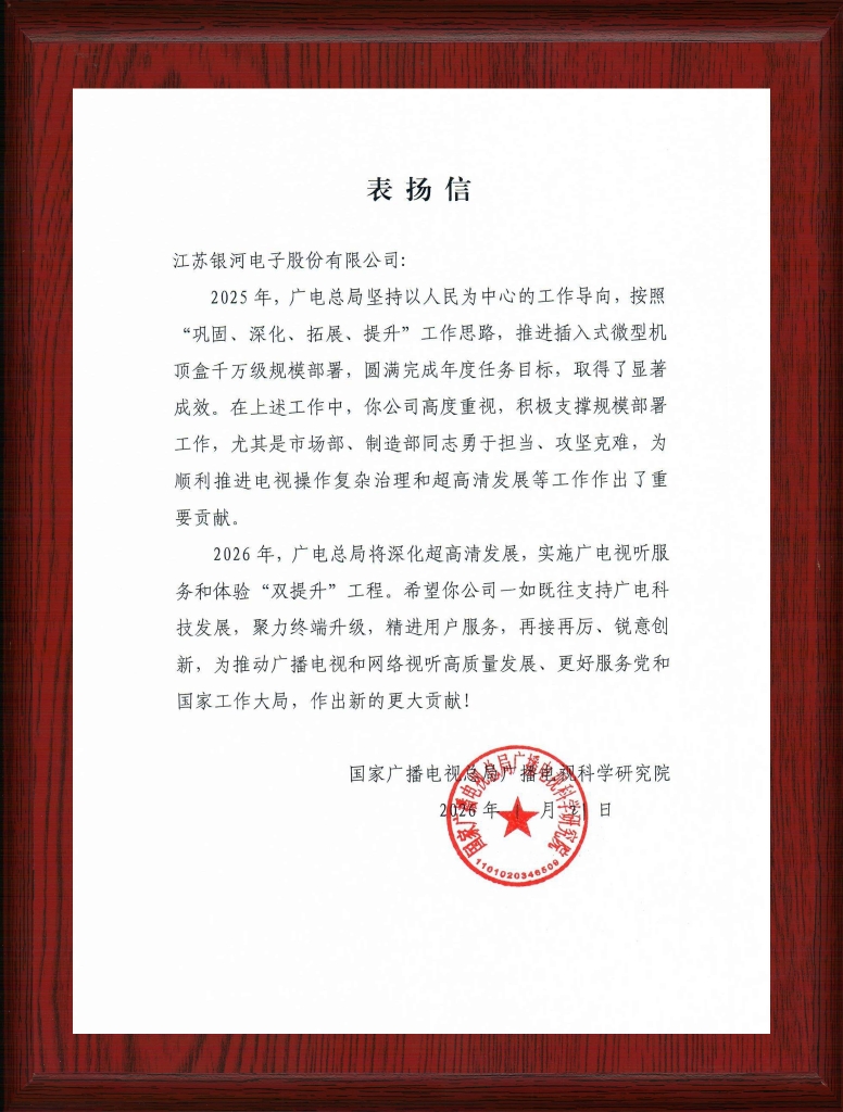 2025年,在国家广播电视总局系统谋划、强力推动,总局广科院、规划院有力支撑,各地广电局积极督导协调下,中国广电、中国移动、中国电信、中国联通等4家运营商,江苏银河电子股份有限公司等19家机顶盒厂商,其他10家遥控器厂商,全力以赴、攻坚克难,已部署超千万套插入式微型机顶盒和通用通控器、超百万端一体化电视,实现新型终端走进千家万户,进一步提升人民群众看电视体验。